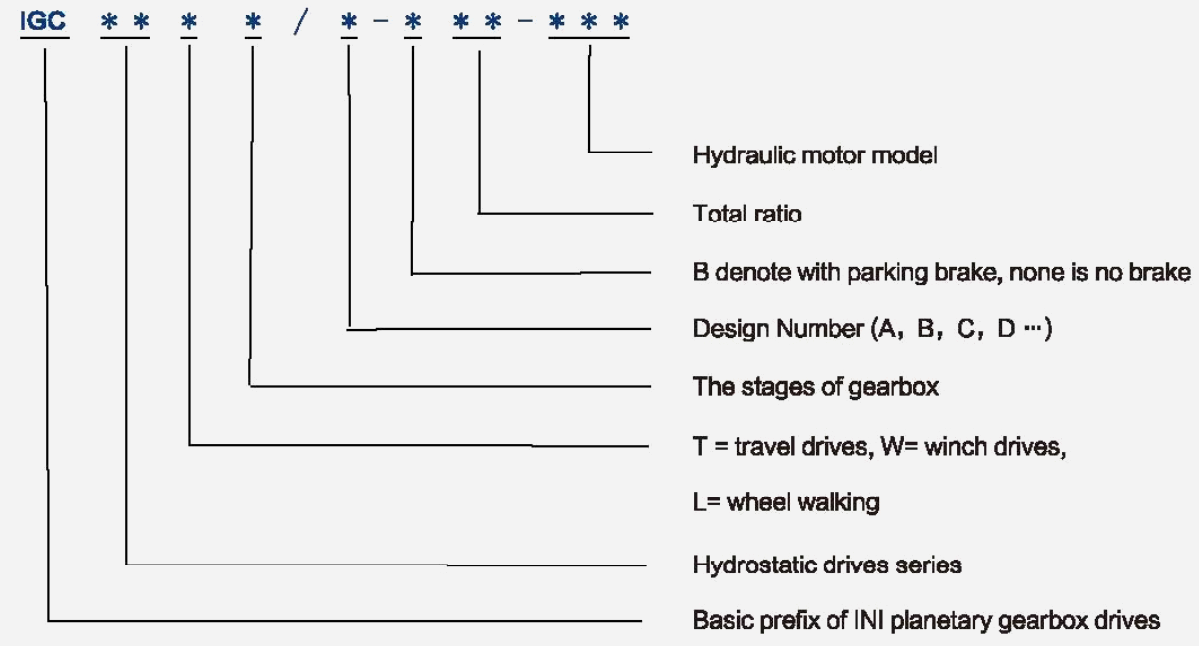 | Cod de serie | Cuplul de ieșire | Raport | Motor hidraulic | Viteza maximă Iopot | Cuplu de franare | Hrake Presa | Greutate | |